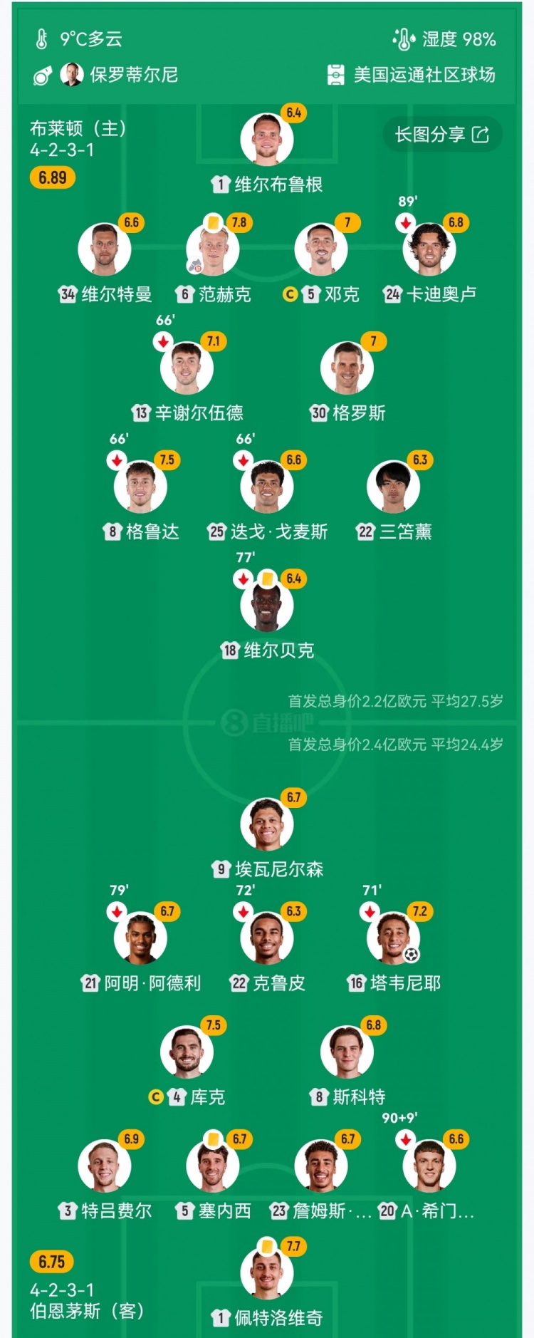 下半场补时8分钟。最终全场比赛结束,布莱顿1-1伯恩茅斯。
