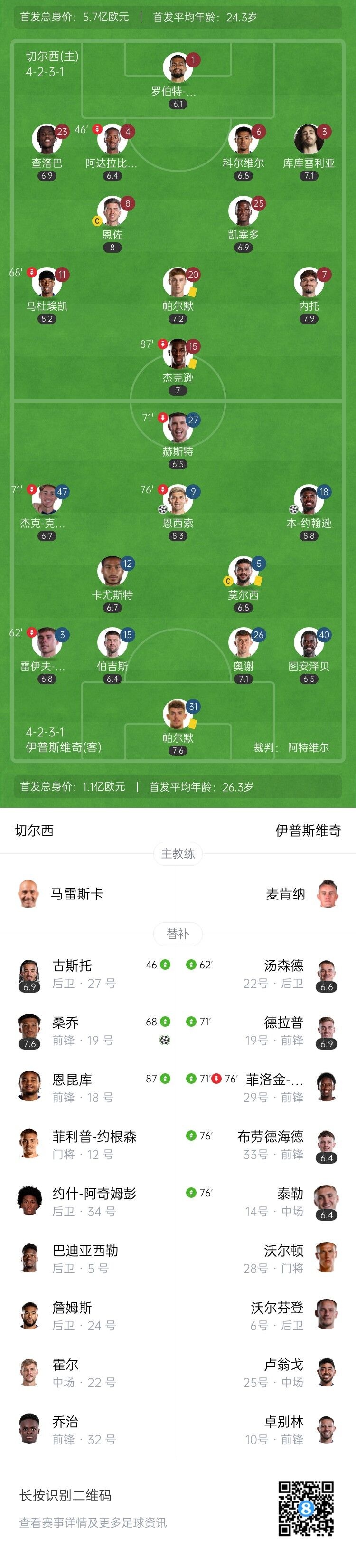 伤停补时6分钟。全场比赛结束,切尔西2-2伊普斯维奇。