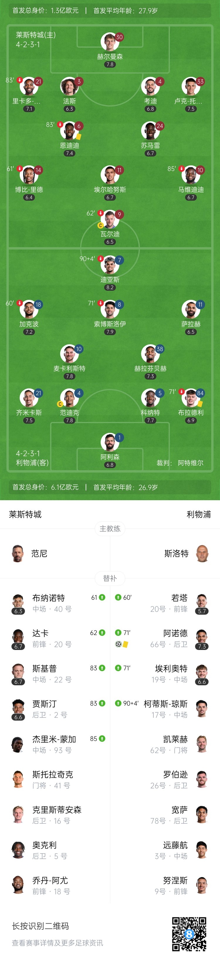 全场比赛结束,最终利物浦1-0莱斯特城。