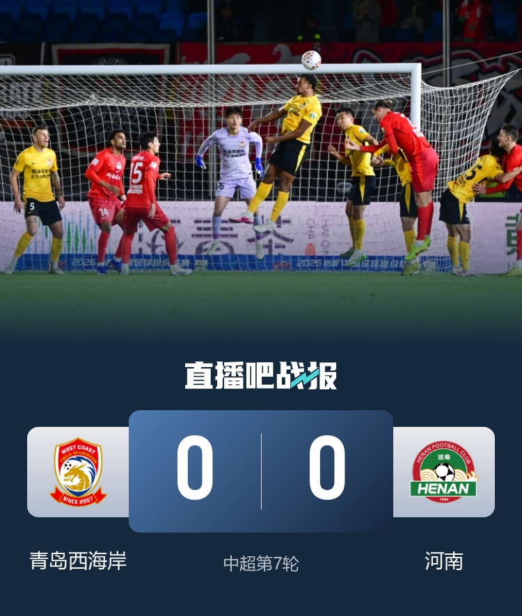 全场比赛结束,青岛西海岸0-0河南。