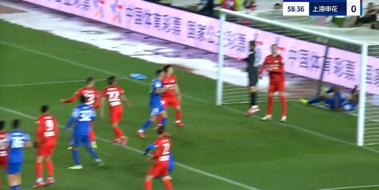 第23分钟,申花左侧角球机会,禁区内卡位时路易斯故意推搡黄锐烽,后者倒地,主裁黄牌警告路易斯↓