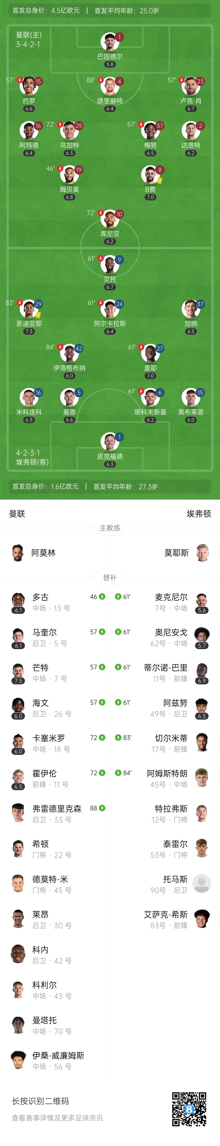 第75分钟,埃弗顿右路进攻,一脚威胁不大的横传球给到弧顶附近,阿玛德回追时不慎自摆乌龙,曼联2-2埃弗顿↓