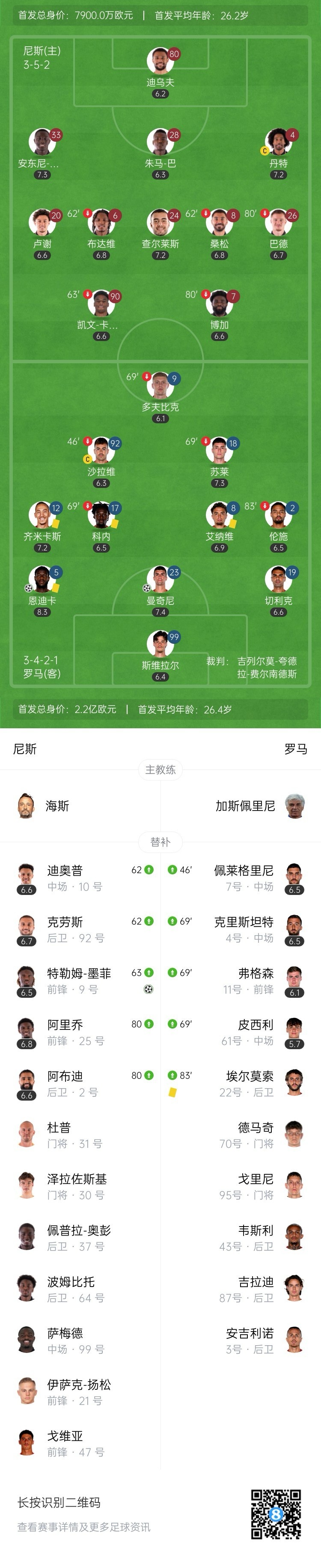 罗马3分钟2球!曼奇尼破门,齐米卡斯助攻!第55分钟,齐米卡斯左路传中,曼奇尼前插禁区凌空捅射入网,尼斯0-2罗马!↓