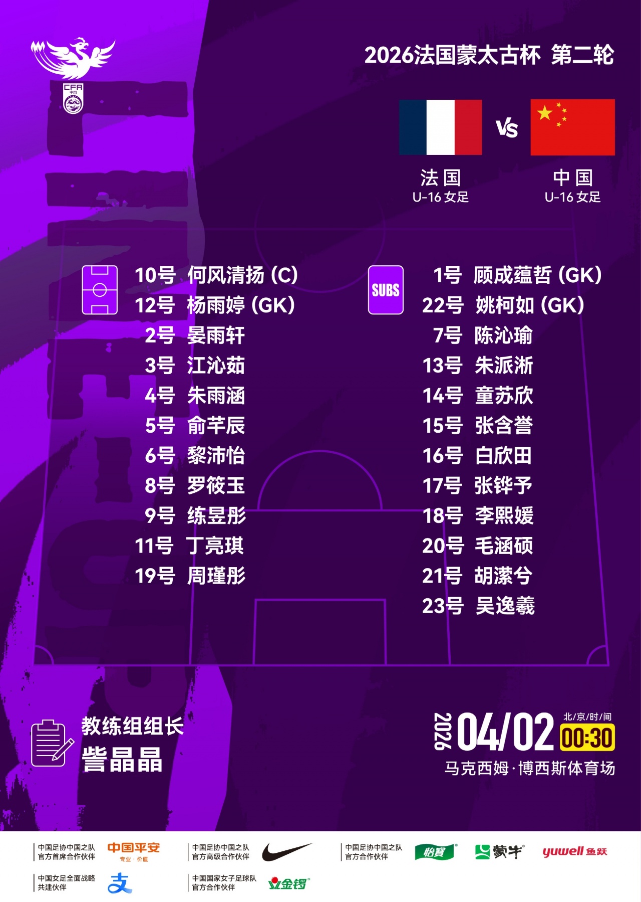 【中国女足U16首发】
