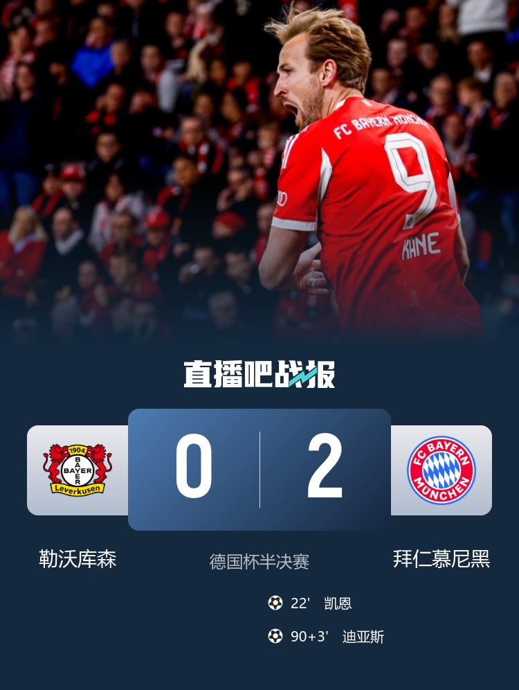 进德国杯决赛!拜仁2-0勒沃库森 凯恩、迪亚斯破门穆西亚拉助攻