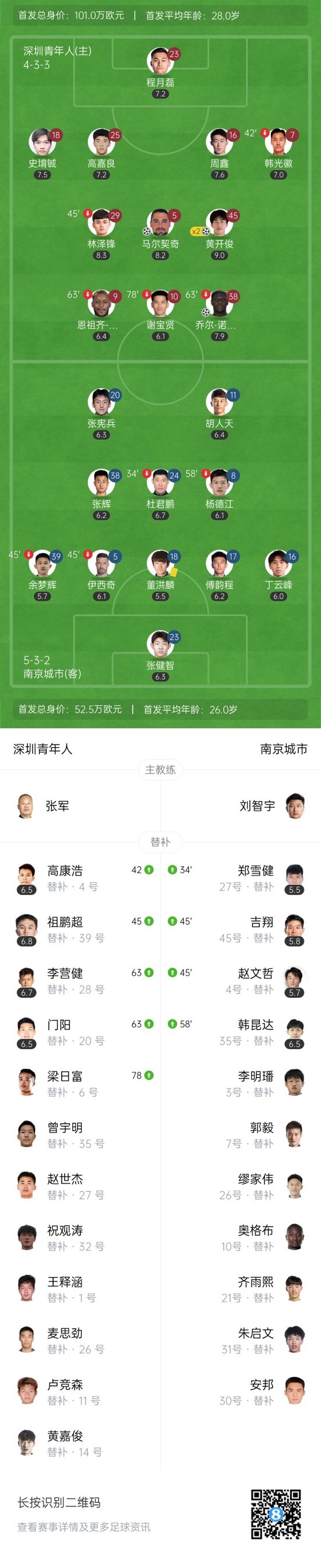 下半场补时6分钟,深圳青年人4-3南京城市。