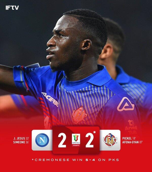 意杯-小西蒙尼头槌洛博特卡失点 那不勒斯点球6-7遭克雷莫纳淘汰